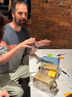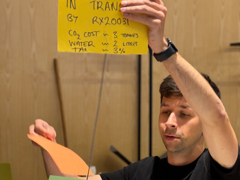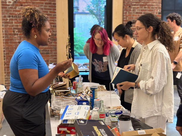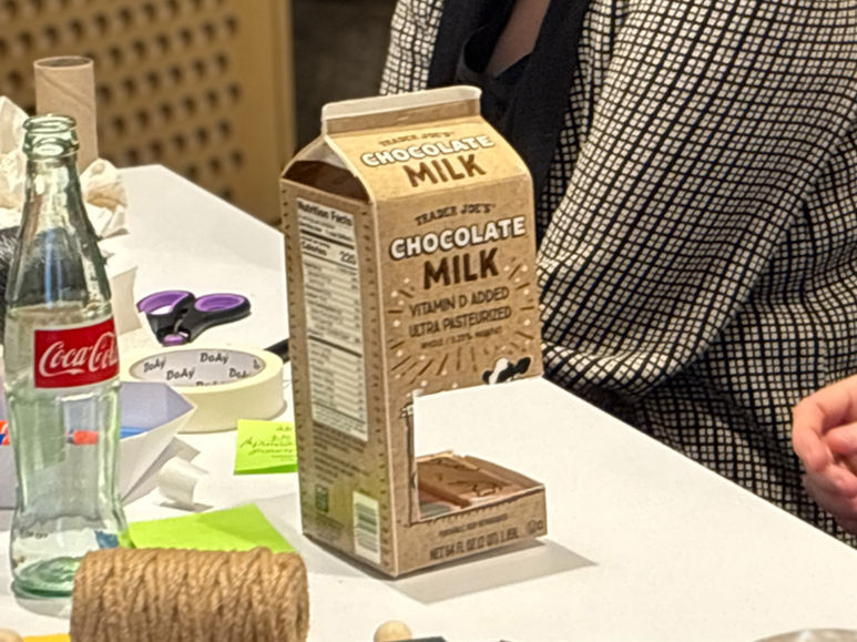 After Mary primed attendees with a series of futuristic, provocative examples, it was time for attendees to team up and imagine the future. Guided by Stuart Candy's "Thing from the future" framework, introduced by Ipsita, each team envisioned a future related to climate change. From that future, they identified a key object that might exist in that future. Then they browsed a library of recyclable materials to build a prototype of that object. Objects ranged from shoes to public spaces to vehicles to wearables—there was quite the variety! Some were hopeful, some were cynical, some were hilarious, but all were thought-provoking.
