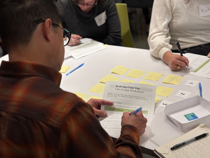 After a few examples, attendees engaged in personal reflection. Guided by questions in a 5 step process, attendees reflected in detail on their day, identified friction points, surfaced underlying thoughts and narratives, reframed their situations as design questions, and planned multiple prototypes for small behavioral experiments to break the negative cycles they were experiencing. It was heavy, but insightful and inspiring!